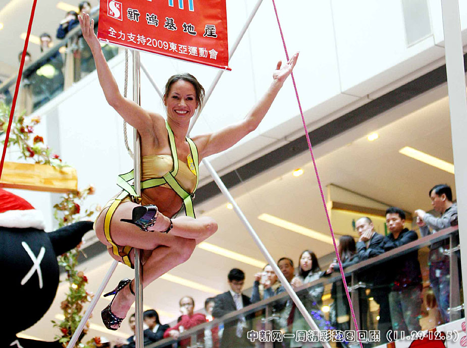 十二月三日,兩項(xiàng)吉尼斯世界紀(jì)錄鋼管舞蹈家Nele Sehrt在香港APM商場(chǎng)三十呎高空獻(xiàn)藝,示范一分鐘抱鋼管倒立動(dòng)作。中新社發(fā) 洪少葵 攝 圖片來源:中國(guó)新聞網(wǎng)>>點(diǎn)擊觀看詳細(xì)內(nèi)容