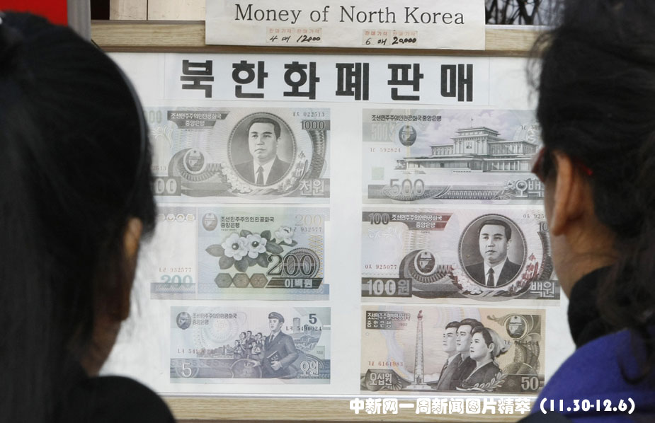 12月1日,韓國(guó)板門店一側(cè)的韓國(guó)游客正在一塊展板前看新出的朝鮮貨幣。據(jù)朝鮮官員當(dāng)日對(duì)外透露,朝鮮于11月30日更換了貨幣,這是該國(guó)十七年來(lái)首次更換貨幣。新舊貨幣兌換率為100比1。圖片來(lái)源:中國(guó)新聞網(wǎng)