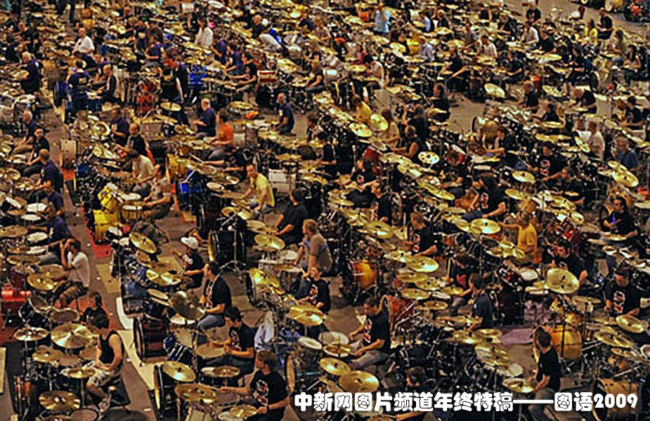 世界最多的鼓手同時(shí)打鼓:582名架子鼓手齊聚一堂,同時(shí)擊打同樣的鼓點(diǎn)長達(dá)5分鐘,和諧程度如出自一人之手,令人咋舌,同時(shí)也創(chuàng)下了又一項(xiàng)新的吉尼斯世界紀(jì)錄。圖片來源:中國新聞網(wǎng)