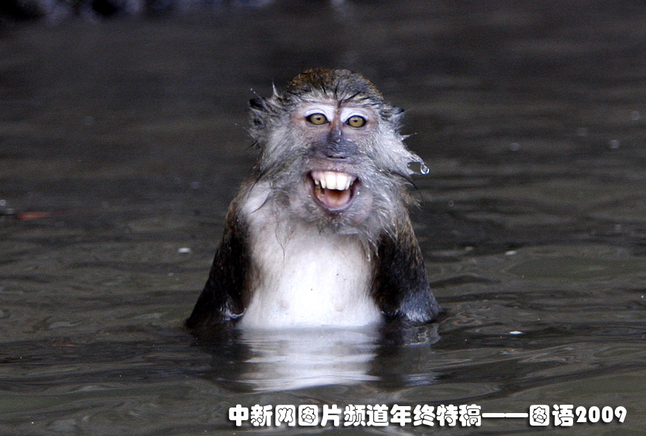 馬來西亞的一個(gè)地質(zhì)公園內(nèi),一只長尾獼猴在水中“大笑”。