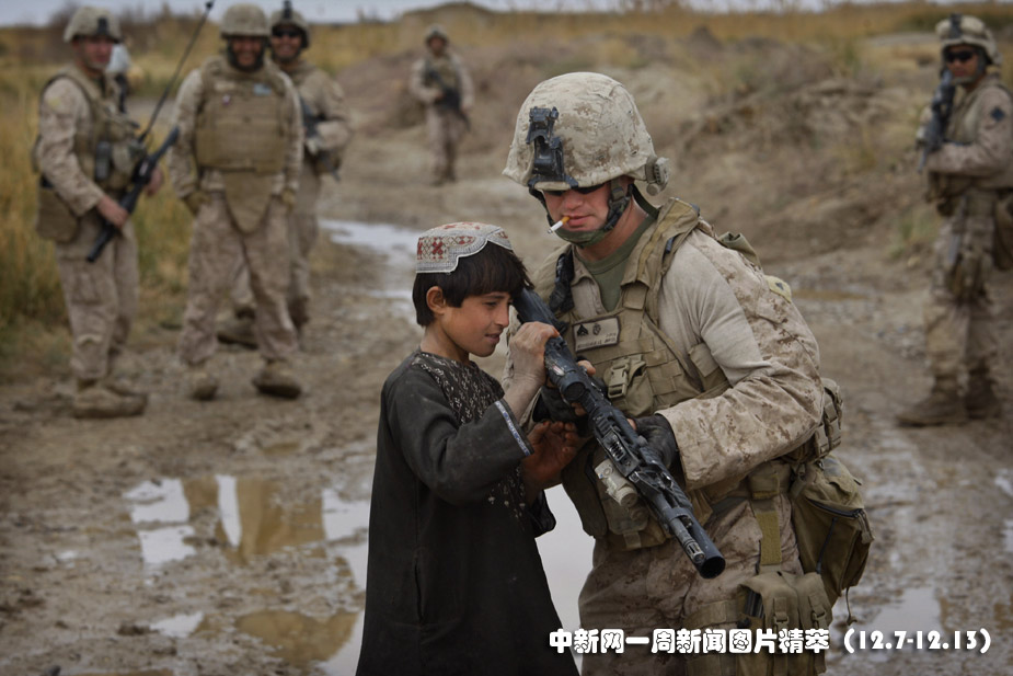 10日(周四),阿富汗,一名美軍士兵正在向一位當(dāng)?shù)啬泻⒄故舅奈淦鳌D片來(lái)源:中國(guó)新聞網(wǎng)