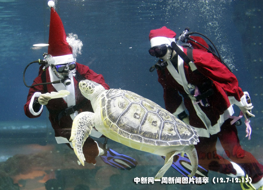 13日(周日),在韓國(guó)首爾的水族館,兩位飼養(yǎng)員身著圣誕老人的服飾在水中與海龜“同游”。圖片來源:中國(guó)新聞網(wǎng)
