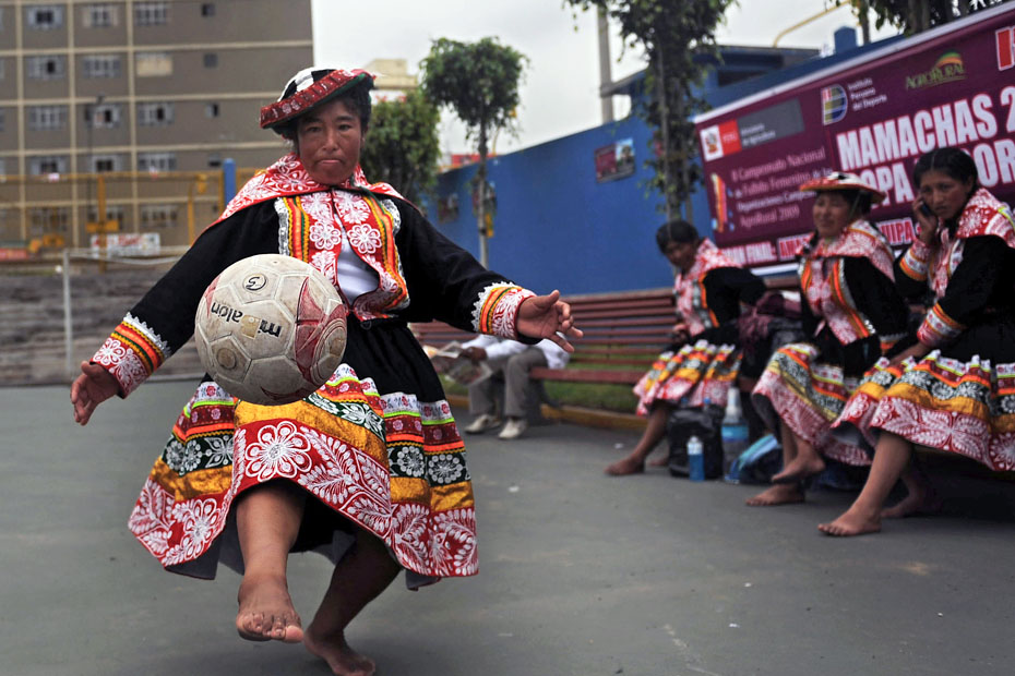 12月12日,秘魯印第安婦女在利馬國家體育場外舉辦了一場特別的足球賽,所有的球員均身著傳統(tǒng)服飾光腳上陣妙趣橫生。圖片來源:中國新聞網(wǎng)