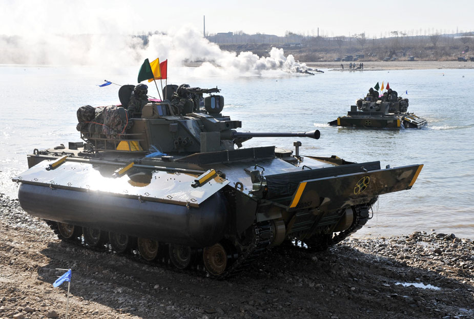12月16日,韓國第20師團機械化部隊在京畿道驪州南漢江一帶進行大規(guī)模渡河實戰(zhàn)訓練。該訓練以培養(yǎng)戰(zhàn)斗執(zhí)行能力為重點。圖片來源:中國新聞網