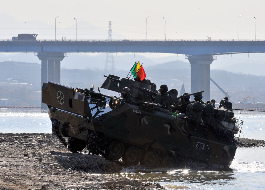 12月16日,韓國第20師團(tuán)機(jī)械化部隊在京畿道驪州南漢江一帶進(jìn)行大規(guī)模渡河實戰(zhàn)訓(xùn)練。該訓(xùn)練以培養(yǎng)戰(zhàn)斗執(zhí)行能力為重點。圖片來源:中國新聞網(wǎng)