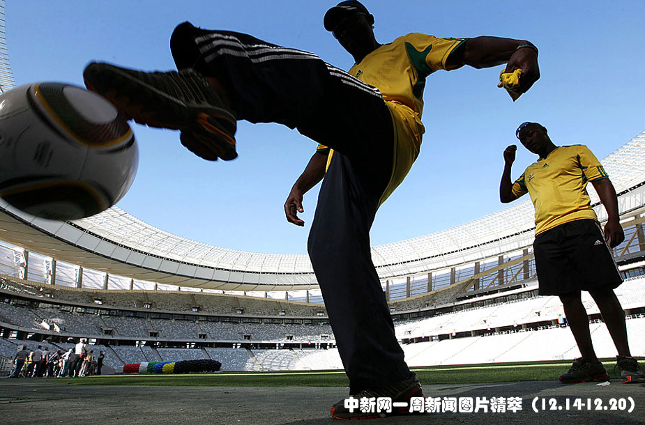 南非開普敦的新體育場(chǎng)竣工儀式在14日(周一)舉行,圖為球迷們?cè)趦x式上進(jìn)行表演。該體育場(chǎng)是為明年南非足球世界杯而建,可容納6.8萬名觀眾。圖片來源:中國(guó)新聞網(wǎng)