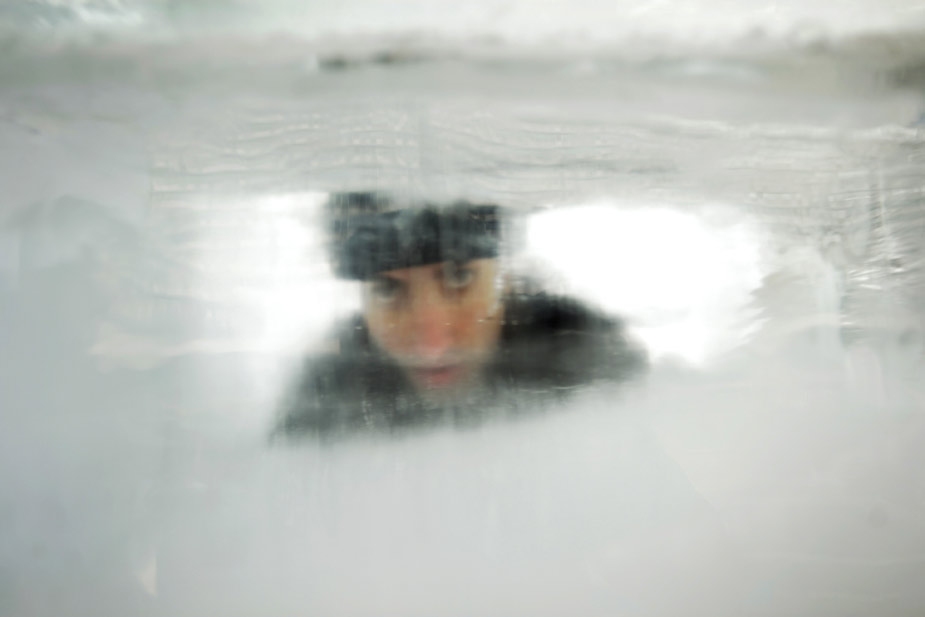 當?shù)貢r間29日早上8點起,以色列魔術(shù)師赫齊·達揚在位于特拉維夫的拉賓廣場上,達揚赤身進入一塊8噸重的冰塊里,開始了挑戰(zhàn)冰屋生存世界紀錄之旅。圖片來源:中國新聞網(wǎng)