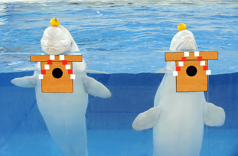圖為海豚也在表演有趣的日本本土文化節(jié)目。
