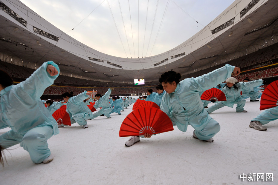 2010年1月1日上午,2010人在被冰雪覆蓋的鳥巢內(nèi)表演了太極拳、武功扇等民族傳統(tǒng)健身項目。中新網(wǎng)記者 金碩 攝