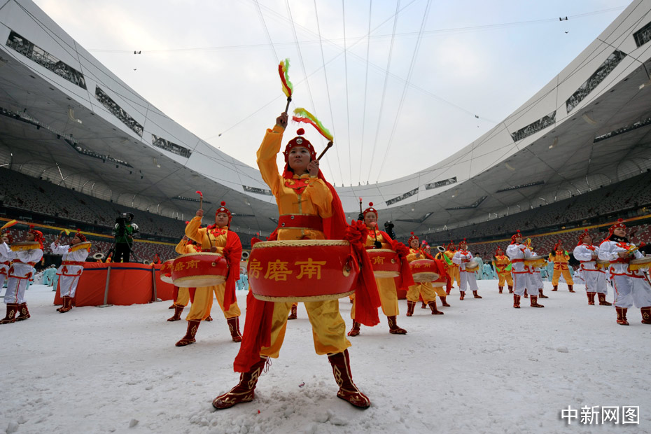 2010年1月1日上午,2010人在被冰雪覆蓋的鳥(niǎo)巢內(nèi)表演了太極拳、武功扇等民族傳統(tǒng)健身項(xiàng)目。中新網(wǎng)記者 金碩 攝