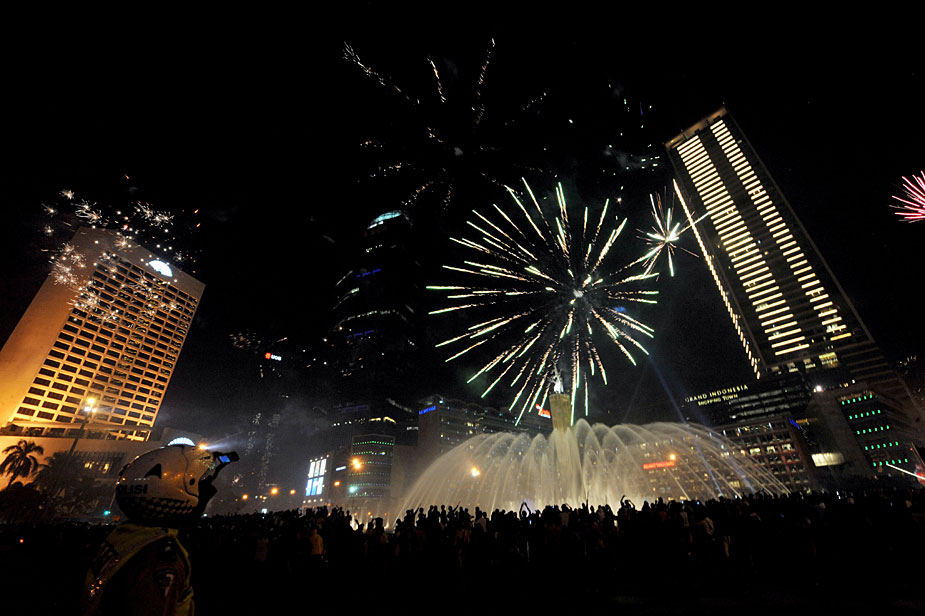 圖為2010年1月1日,印尼首都雅加達人們?nèi)挤牌痨披惖臒熁ā?/p>
