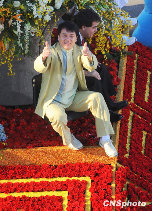 美國(guó)當(dāng)?shù)貢r(shí)間1月1日,第121屆美國(guó)玫瑰花車(chē)大游行在加州帕薩迪納市隆重舉行。著名影星成龍助陣中國(guó)上海世博花車(chē)。圖片來(lái)源:中國(guó)新聞網(wǎng)