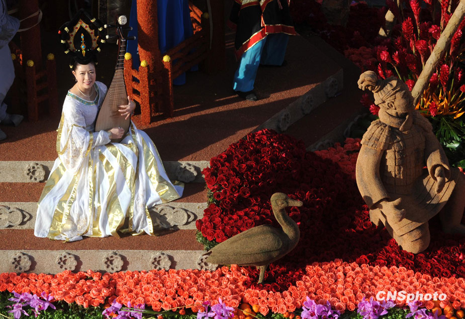 美國(guó)當(dāng)?shù)貢r(shí)間1月1日,第121屆美國(guó)玫瑰花車大游行在加州帕薩迪納市隆重舉行。著名影星成龍助陣中國(guó)上海世博花車。圖片來(lái)源:中國(guó)新聞網(wǎng)
