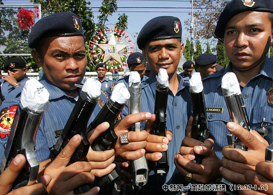 12月29日,菲律賓首都南部的塔吉格市警察部隊(duì)為了防止警務(wù)人員在慶祝新年時(shí)胡亂開槍,下令用膠紙把槍口封起來(lái)。圖片來(lái)源:中國(guó)新聞網(wǎng)>>點(diǎn)擊觀看詳細(xì)內(nèi)容