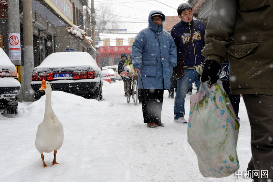 在北京街道上,一只鵝走在積雪中。中新網記者 金碩 攝