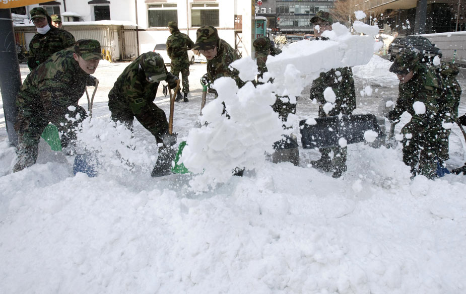 四日,韓國(guó)大部分地區(qū)遭遇大雪。至下午二時(shí)左右,首爾地區(qū)積雪厚度超過二十八厘米,這是韓國(guó)自一九三七年開始進(jìn)行積雪量觀測(cè)以來的最新紀(jì)錄。圖為1月5日,韓國(guó)士兵在街頭除雪。