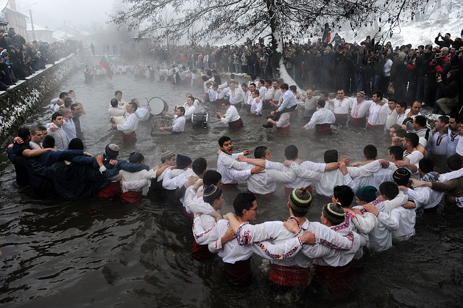 1月6日,在保加利亞卡洛菲爾市,人們?cè)诒涞暮铀刑鸨<永麃喢耖g舞蹈霍洛舞,相互祝福在新的一年里身體健康,事事順?biāo)。圖片來(lái)源:中國(guó)新聞網(wǎng)