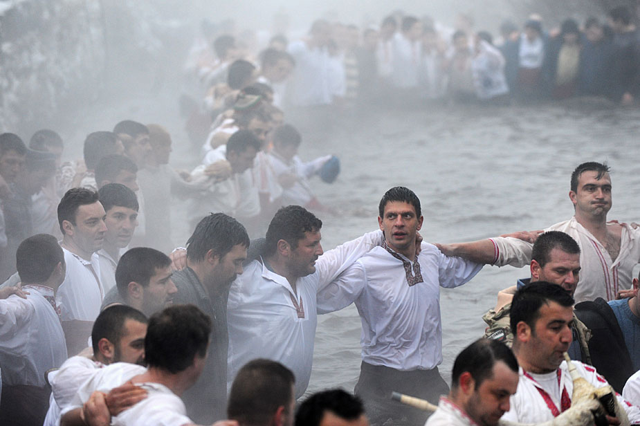 1月6日,在保加利亞卡洛菲爾市,人們在冰冷的河水中跳起保加利亞民間舞蹈霍洛舞,相互祝福在新的一年里身體健康,事事順遂。圖片來源:中國新聞網(wǎng)