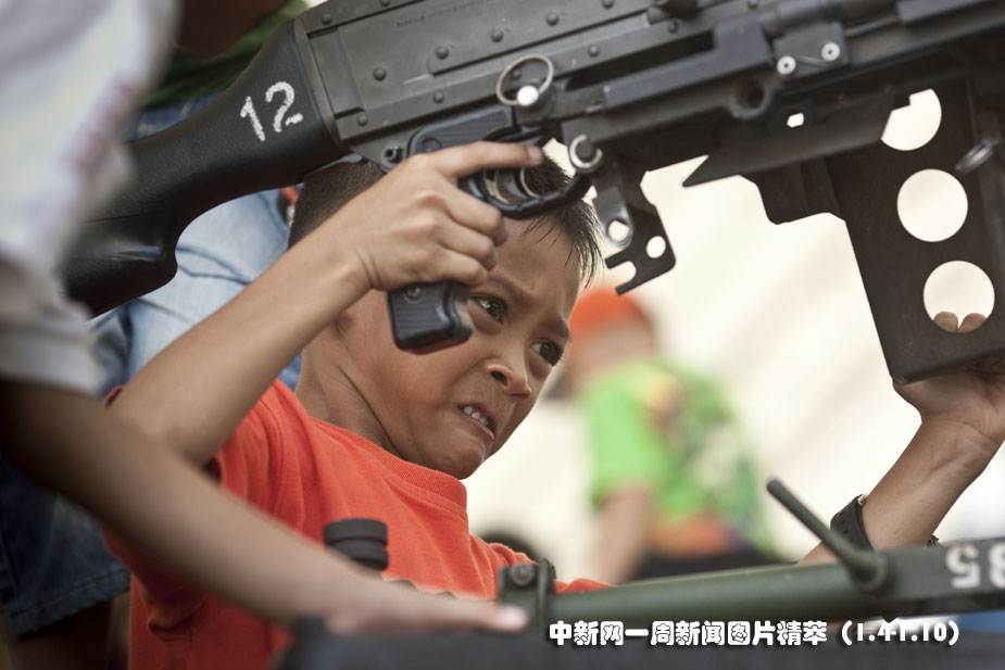 1月9日(周六),當天是泰國的兒童節(jié),一名男孩正在體驗沒有裝彈的機槍。圖片來源:中國新聞網