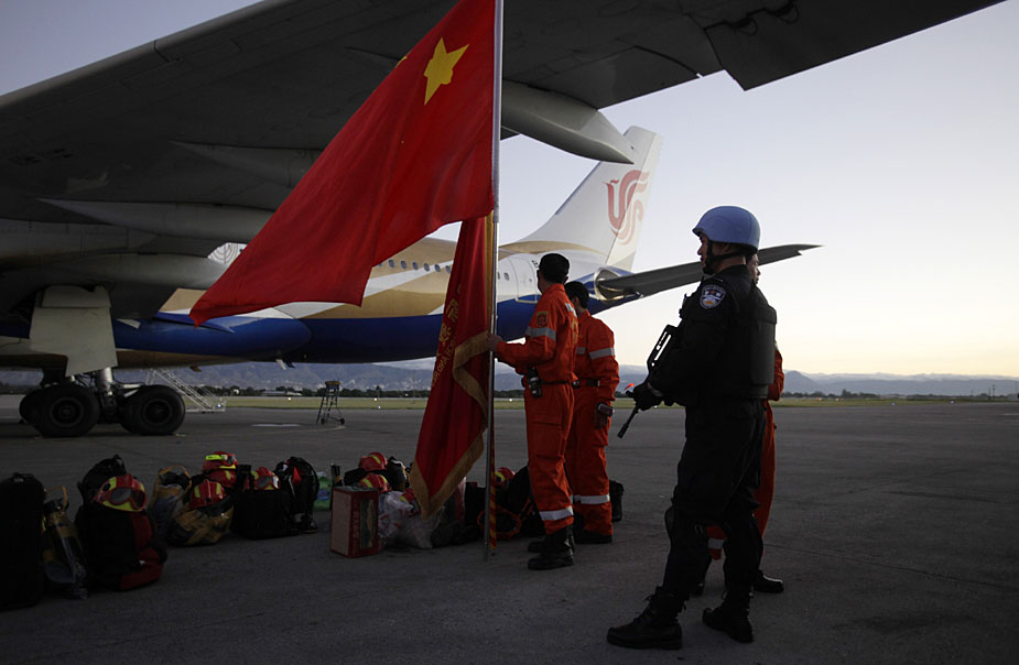 1月14日,中國國際救援隊乘坐中國國際航空公司專機,飛行20個小時抵達海地首都太子港展開地震救援工作。