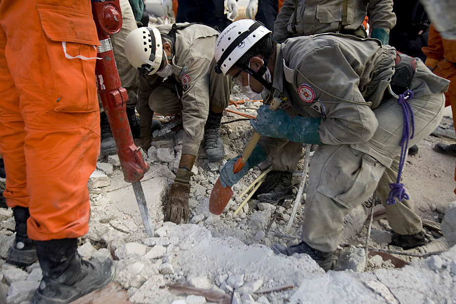 1月16日,海地首都太子港,中國國際救援隊在聯(lián)海團總部對遇難者進行搜尋工作。此前八名中方失蹤人員的遺體已全被找到。圖片來源:中國新聞網(wǎng)