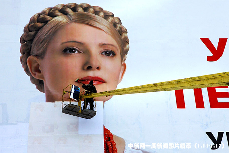 1月14日(周四),一名工人在基輔張貼烏克蘭總理季莫申科(Yulia Tymoshenko)的巨幅海報。她向選民承諾若當選總統(tǒng),將修復烏克蘭與俄羅斯的關(guān)系。投票從本周日開始。圖片來源:中國新聞網(wǎng)