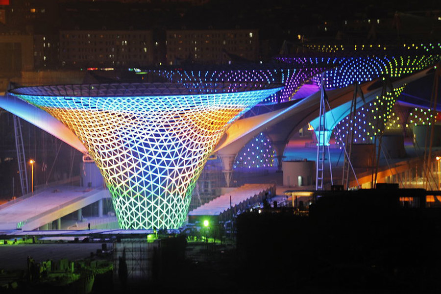 隨著世博腳步臨近,世博工地正熱火朝天的加快施工進(jìn)度,夜晚世博場(chǎng)館演繹燈光秀。郭長(zhǎng)耀/CFP