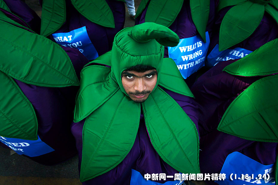 1月22日,印度班加羅爾綠色和平組織的活動(dòng)者打扮成茄子抗議食用轉(zhuǎn)基因茄子。圖片來(lái)源:中國(guó)新聞網(wǎng)