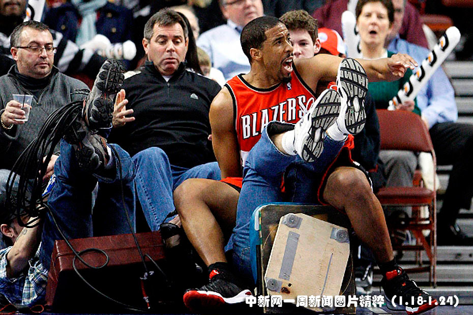 1月20日,波特蘭開創(chuàng)者隊(duì)后衛(wèi)米勒在客場(chǎng)對(duì)陣費(fèi)城76人隊(duì)的比賽中搶球撞上場(chǎng)邊的電視臺(tái)工作人員。波特蘭開創(chuàng)者最終以98比90擊敗費(fèi)城76人隊(duì)。圖片來源:中國(guó)新聞網(wǎng)