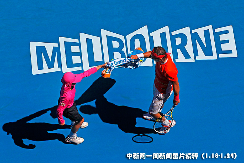 1月20日,在于墨爾本舉行的澳大利亞網(wǎng)球公開賽上,西班牙球手納達(dá)爾在對陣斯洛伐克球手拉科的比賽中從球童手中接過毛巾。納達(dá)爾最終擊敗拉科晉級。圖片來源:中國新聞網(wǎng)