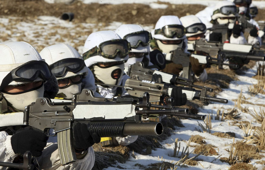 1月27日,韓國江原道,韓國陸軍部隊(duì)在嚴(yán)寒中進(jìn)行戰(zhàn)術(shù)訓(xùn)練。