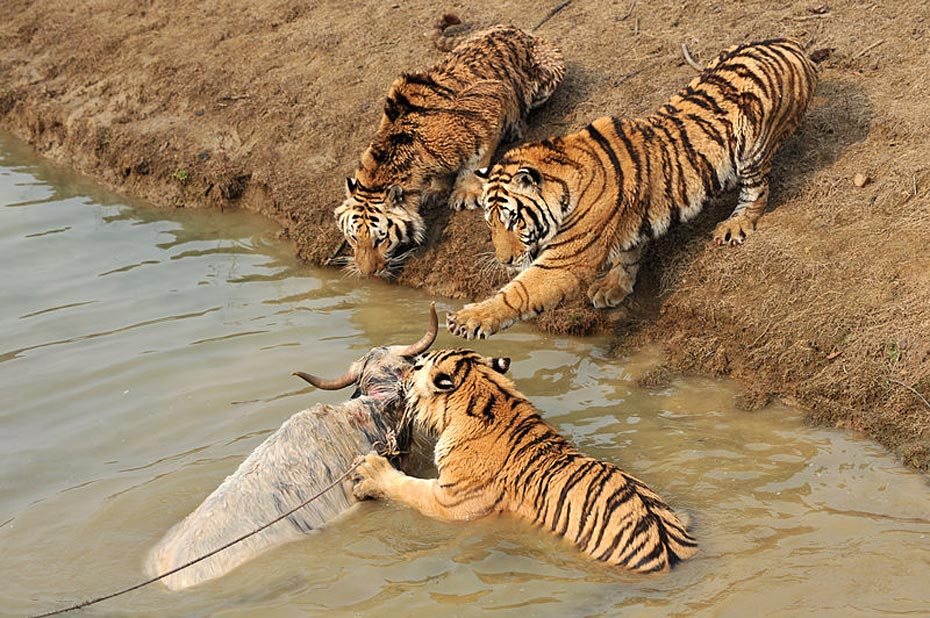 但水中的牦牛一動彈,更加激發(fā)了老虎的野性,這時(shí)有三、四只老虎撲了上來,工作人員拼命往水塘邊上拽牦牛,無奈一只虎王一下就咬住了牦牛的脖子怎么都不肯松口,繼而上演了人和老虎的“拔河比賽”。