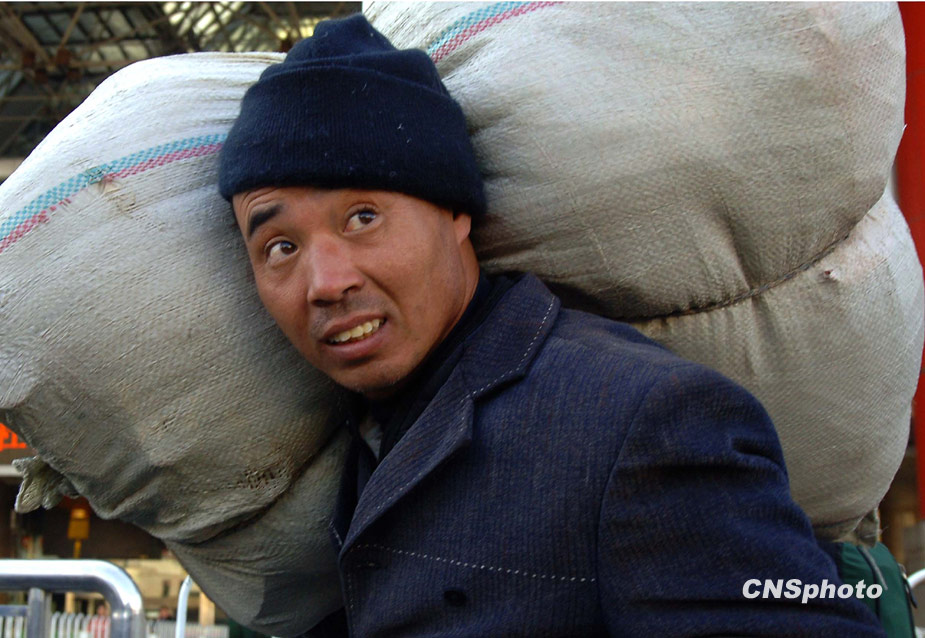 一年一度的春運今日起正式開始。2010年的春運從1月30日起至3月10日,為期40天,其中節(jié)前15天,節(jié)后25天。據(jù)權(quán)威預(yù)測,今年春運客運量料超25億人次。 1月30日,北京西站廣場上,一名中國民工扛著行囊和打工的收獲,返鄉(xiāng)過節(jié)。中新社發(fā) 鄒憲 攝
