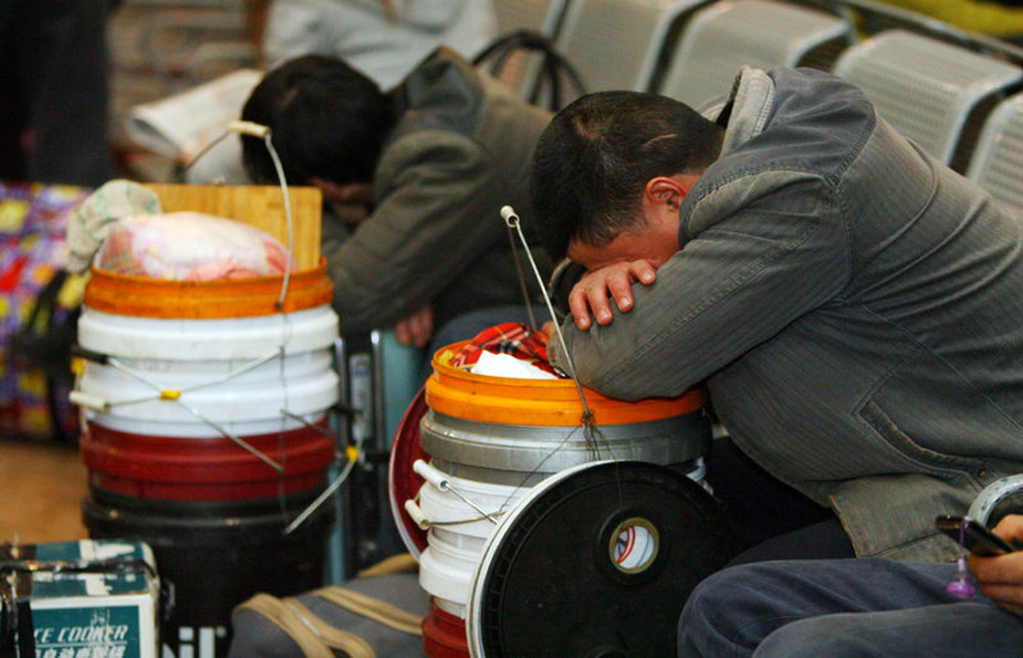 一年一度的春運(yùn)今日起正式開(kāi)始。2010年的春運(yùn)從1月30日起至3月10日,為期40天,其中節(jié)前15天,節(jié)后25天。據(jù)權(quán)威預(yù)測(cè),今年春運(yùn)客運(yùn)量料超25億人次。圖為1月30日,幾名旅客在西安火車(chē)站候車(chē)大廳熟睡。 侯智 攝
