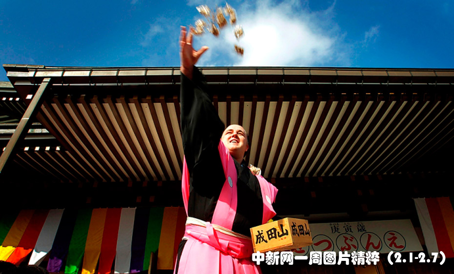 2月3日(周三),在日本千葉成田的一座寺廟,相撲新手、來(lái)自愛(ài)沙尼亞的巴魯托(Baruto)向人群拋撒袋裝的大豆。這種儀式通常在農(nóng)歷新年進(jìn)行,據(jù)說(shuō)可以帶來(lái)好運(yùn)。圖片來(lái)源:中國(guó)新聞網(wǎng)