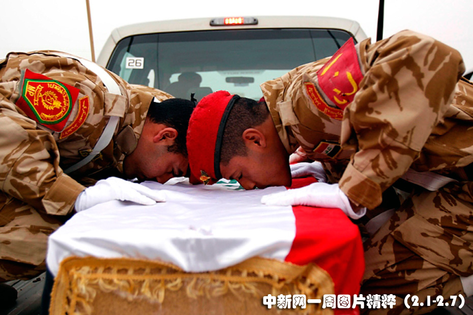 2月4日(周四),伊拉克士兵親吻一名同伴的靈柩,這名士兵的遺體在伊拉克巴斯拉附近的邊界處被交接。在兩伊戰(zhàn)爭中喪生的九名伊拉克人的遺體周四回到伊拉克。圖片來源:中國新聞網(wǎng)