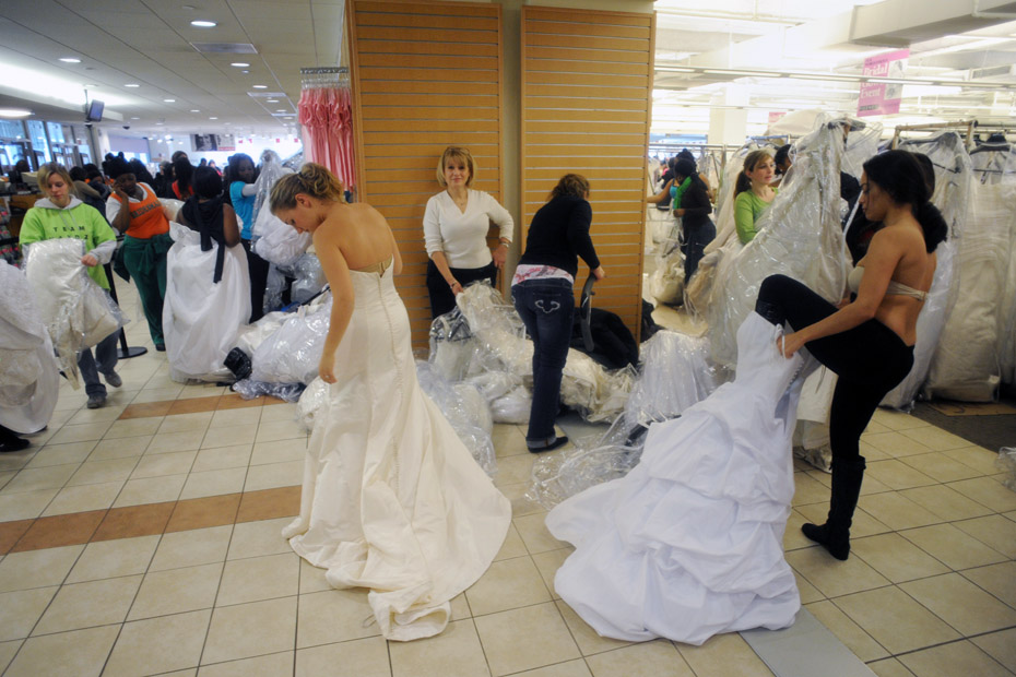 近日,美國紐約一年一度的“新娘快跑”婚紗促銷活動舉行。千余名來自全美各地的準(zhǔn)新娘和親朋好友,早早就在門口等候,平時上千美元婚紗只需要五分之一的價格就能帶回家。圖片來源:中國新聞網(wǎng)