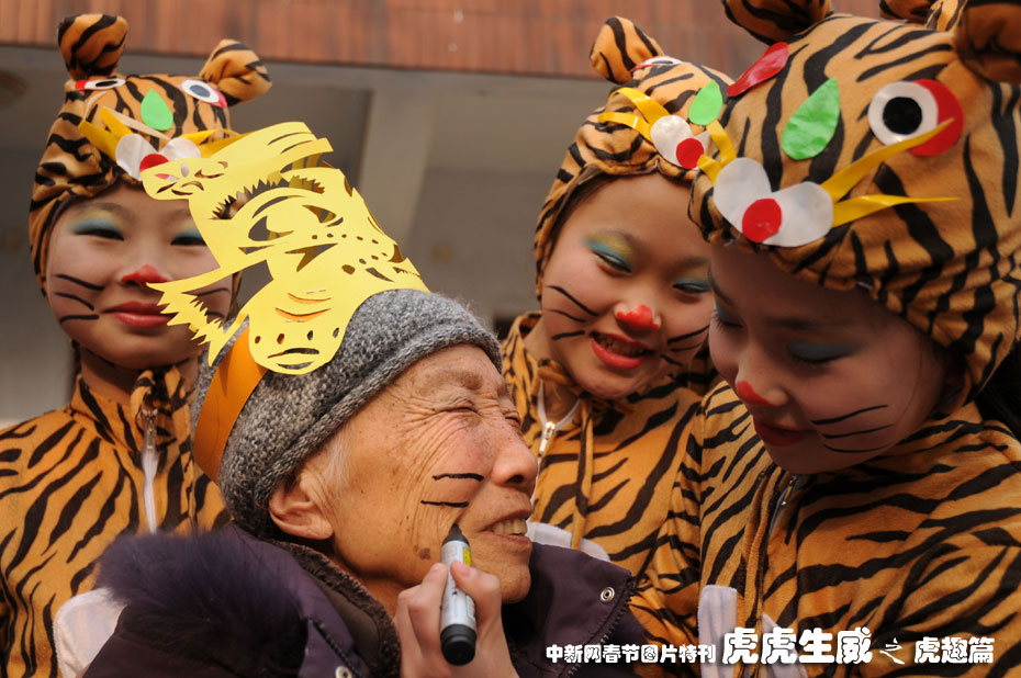 2月5日,河南省南陽市第十六小學的孩子們裝扮成可愛的虎娃,向該市臥龍敬老院的老人們送去了新春的祝福。中新社發(fā) 付海厚 攝
