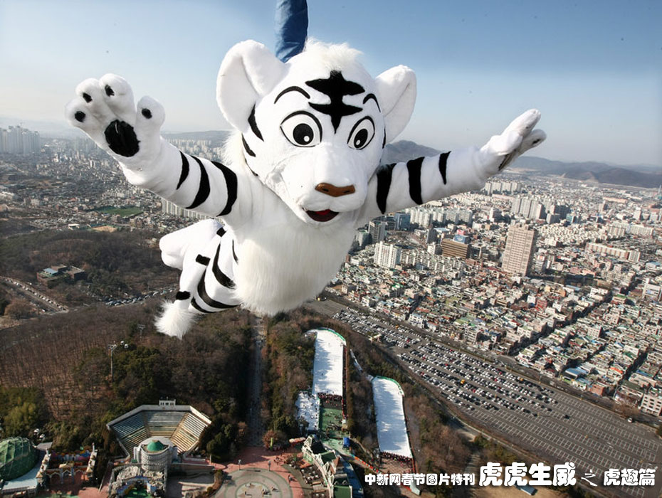 1月3日,為慶祝時(shí)隔60年迎來(lái)的白虎年,韓國(guó)大邱市民身穿白虎服裝跳蹦極,向人們致以新年的問(wèn)候。圖片來(lái)源:CFP