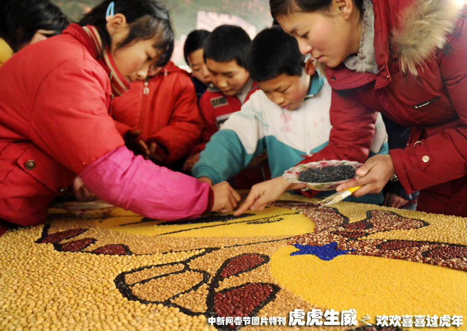 2009年12月中旬,山東省棗莊市山亭區(qū)建銀希望小學(xué)手工制作興趣小組的學(xué)生在老師的指導(dǎo)下,用黃豆、黑豆、小麥、豌豆、小米等糧食粘貼成活潑可愛的“五谷虎”,喜迎即將到來的農(nóng)歷虎年。圖為棗莊市山亭區(qū)建銀希望小學(xué)手工制作興趣小組的學(xué)生和老師一起制作“五谷虎”。中新社發(fā) 李宗憲 攝