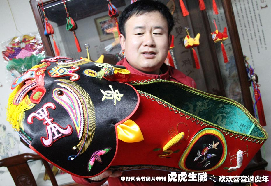 1月18日,南京民間藝人高勇與父母一起花費(fèi)三個月時間制作了一只長80厘米、高35厘米的虎頭鞋,日前亮相南京市民俗博物館。據(jù)悉,改鞋共用絲綢3.5米,耗費(fèi)金絲線、絲線和棉線約750米。中新社發(fā) 阿董 攝