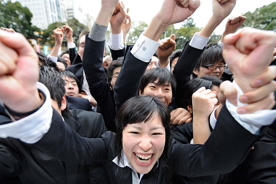 2月10日,日本東京職業(yè)學校的學生在求職動員會上伸出拳頭展現(xiàn)信心。日本的失業(yè)率達5%,2011屆畢業(yè)生將面臨嚴峻就業(yè)形式。圖片來源:中國新聞網(wǎng)