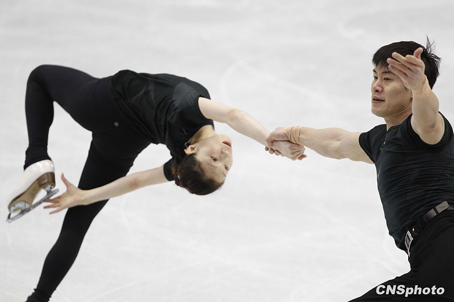 當(dāng)?shù)貢r(shí)間2月13日,中國花樣滑冰隊(duì)龐清/佟健、張丹/張昊在溫哥華太平洋體育館,利用最后的休息時(shí)間重復(fù)練習(xí)積極備戰(zhàn)即將到來的比賽。中新社記者 盛佳鵬 攝