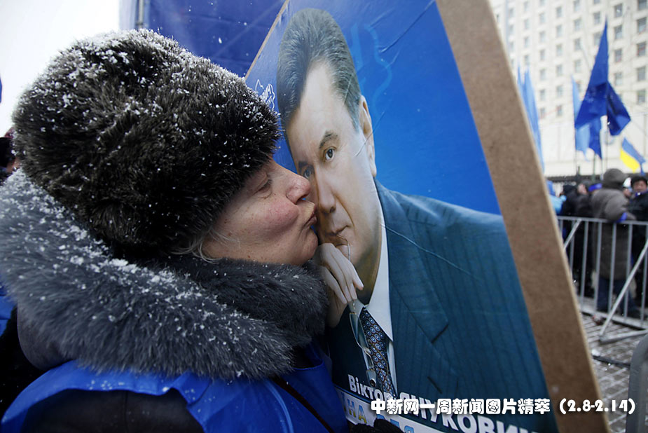 周一(8日)烏克蘭反對(duì)黨領(lǐng)袖、總統(tǒng)候選人亞努科維奇(Viktor Yanukovych)的支持者在基輔的一個(gè)集會(huì)上,親吻亞努科維奇的海報(bào)。大部分選票結(jié)果顯示,亞努科維奇在上周日的大選中戰(zhàn)勝了總理季莫申科。