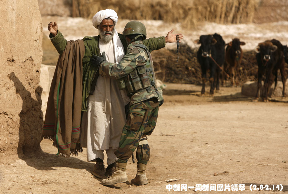 周五(12日),一名阿富汗士兵在檢查從塔利班盤踞點(diǎn)出來的阿富汗農(nóng)民。當(dāng)日凌晨,駐阿聯(lián)軍出動1.5萬名軍人進(jìn)攻了塔利班老巢馬拉赫市。