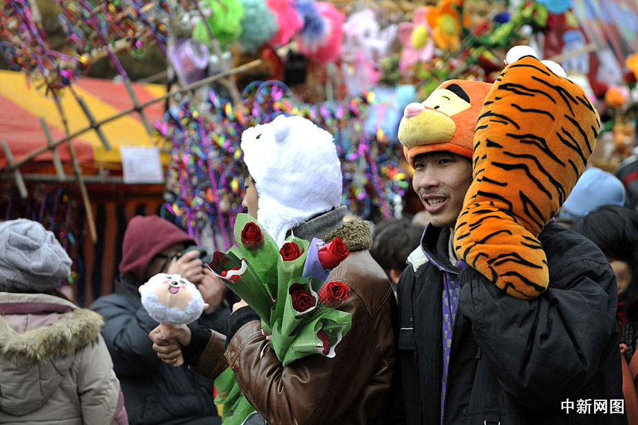 2月14日,農(nóng)歷正月初一,北京各大傳統(tǒng)廟會(huì)、洋廟會(huì)爭相開幕,許多游客頭戴虎年飾品開心游廟會(huì)。中新網(wǎng)記者 金碩 攝