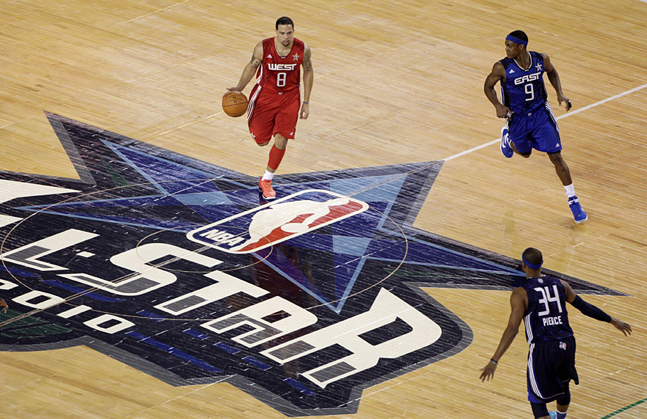 圖為全明星賽賽場(chǎng)上,西部明星隊(duì)正在進(jìn)攻。