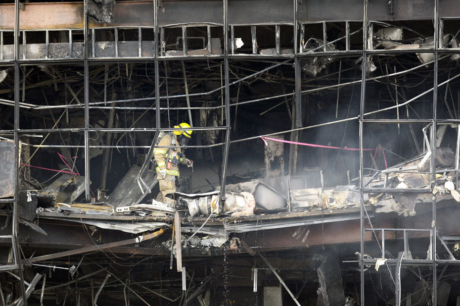 撞機(jī)事件導(dǎo)致大樓一面的幾十扇窗戶粉碎,一些樓層天花板塌陷,通過(guò)電視畫(huà)面,可以看到大樓二三樓層濃煙滾滾,黑煙中不時(shí)有竄出的火焰。