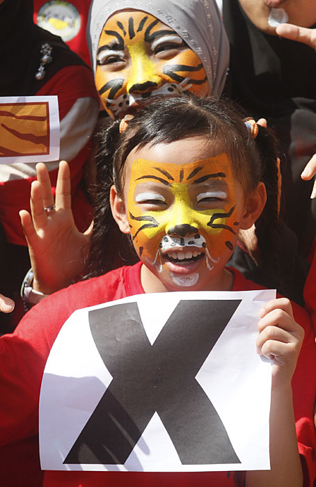 2月20日,馬來西亞民眾圍聚在首都吉隆坡附近的佛光山東禪寺,紛紛將自己繪成老虎的樣子,呼吁大家保護野生虎。圖片來源:中國新聞網(wǎng)