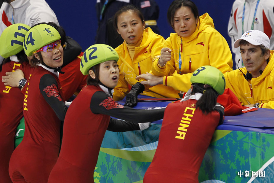 在裁判宣布韓國隊(duì)犯規(guī)后,一直等候著最終結(jié)果的中國姑娘忘情地?fù)湎蚪叹毾。圖片清楚地顯示,興奮的王濛撲到教練李琰前面寬寬的防護(hù)墊上,她的右腿無意間高高抬起,冰刀刮到了跟在她身后的張會的下巴。王濛意識到自己闖了禍,馬上關(guān)切地回頭察看張會的傷情。四位姑娘舉著國旗慶祝勝利時,張會用手捂著她的下巴,漸漸地鮮血浸濕了她的手套。